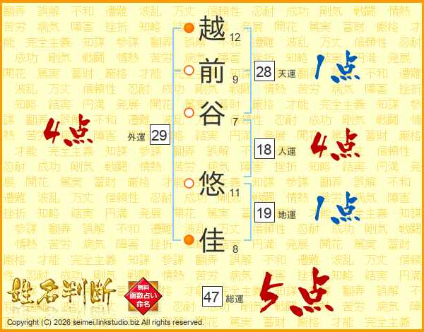 越(12画)前(9画)谷(7画) 悠(11画)佳(8画)