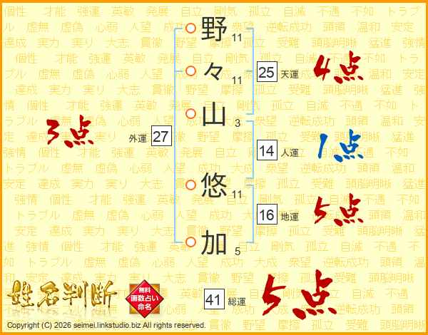 野(11画)々(11画)山(3画) 悠(11画)加(5画)