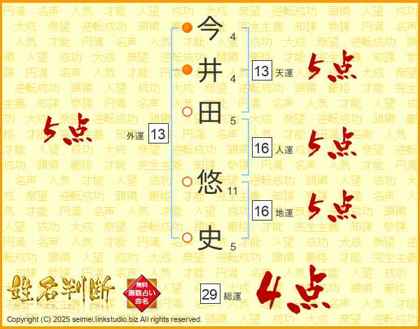 今(4画)井(4画)田(5画) 悠(11画)史(5画)