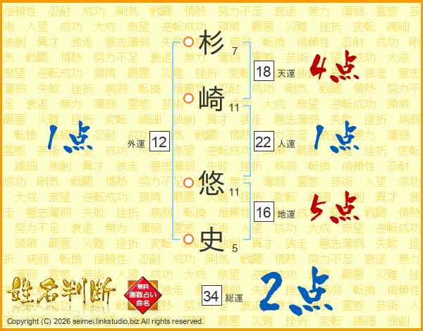 杉(7画)崎(11画) 悠(11画)史(5画)