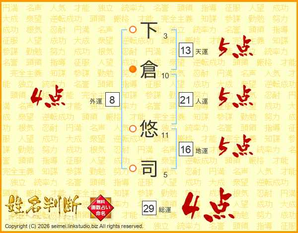 下倉悠司さんの総運は29画の4点!