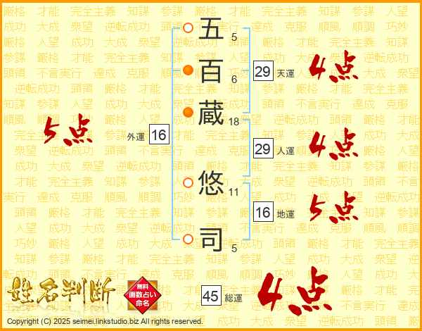五百蔵悠司さんの総運は45画の4点!