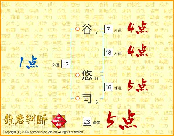 あなたの人生を表す1番重要な運勢です。生涯を通じて影響する総合運となり、主に50歳以降の晩年期に影響を及ぼします。苗字と名前の合計画数。