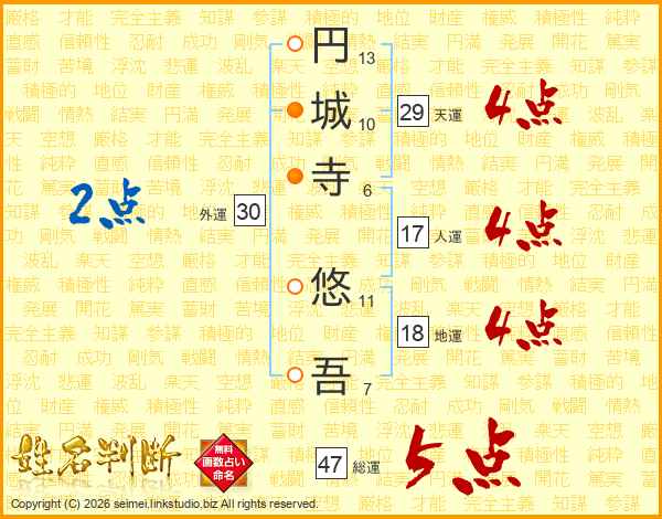 円(13画)城(10画)寺(6画) 悠(11画)吾(7画)