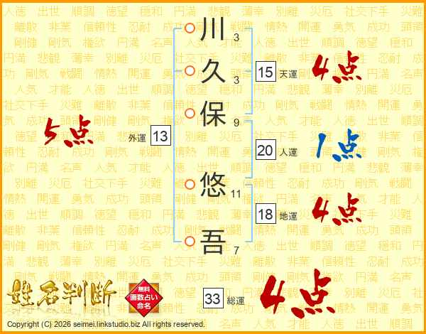 川(3画)久(3画)保(9画) 悠(11画)吾(7画)