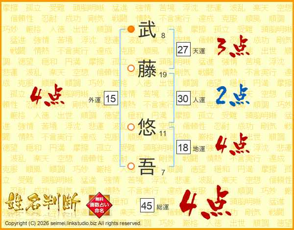 武(8画)藤(19画) 悠(11画)吾(7画)