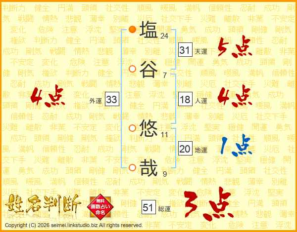 塩(24画)谷(7画) 悠(11画)哉(9画)
