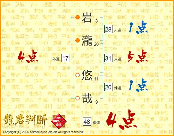 岩(8画)瀧(20画) 悠(11画)哉(9画)