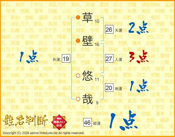 草(10画)壁(16画) 悠(11画)哉(9画)