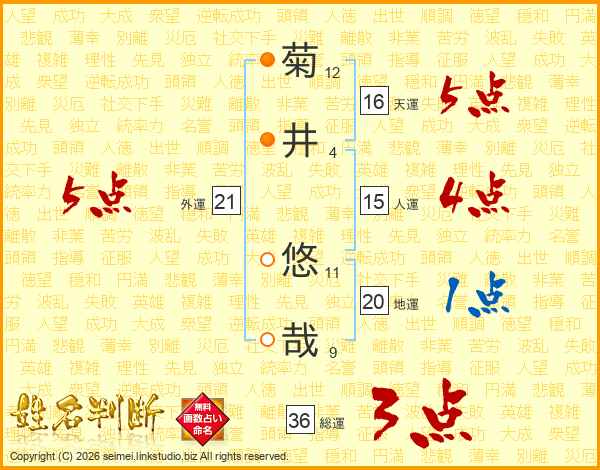菊(12画)井(4画) 悠(11画)哉(9画)