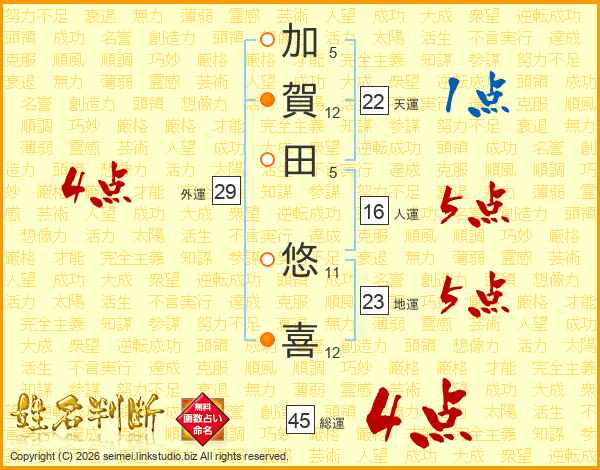 加(5画)賀(12画)田(5画) 悠(11画)喜(12画)