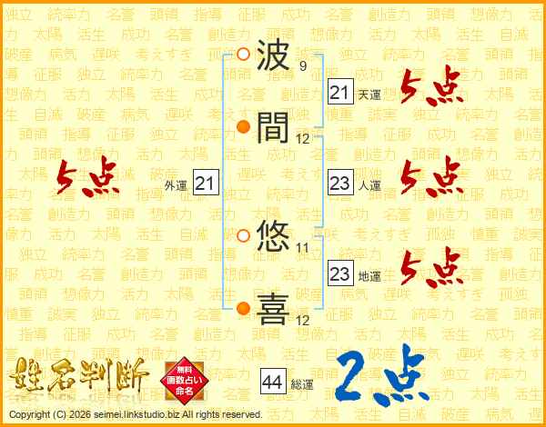 波(9画)間(12画) 悠(11画)喜(12画)