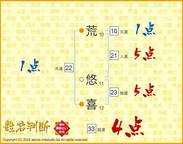 荒悠喜さんの総運は33画の4点!