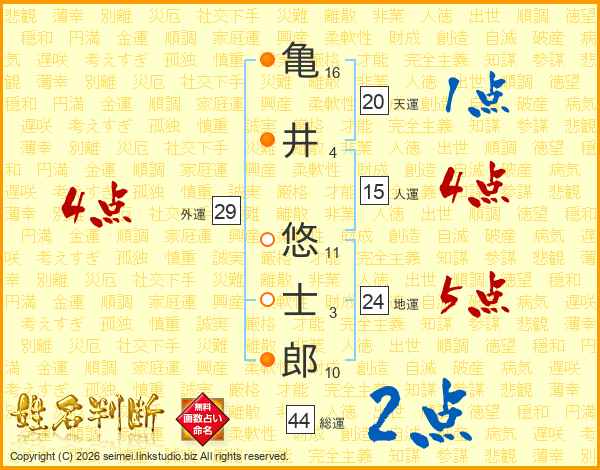亀井悠士郎さんの総運は44画の2点!