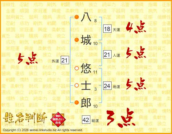 八(8画)城(10画) 悠(11画)士(3画)郎(10画)
