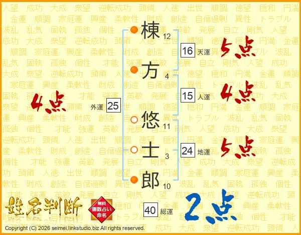 棟(12画)方(4画) 悠(11画)士(3画)郎(10画)