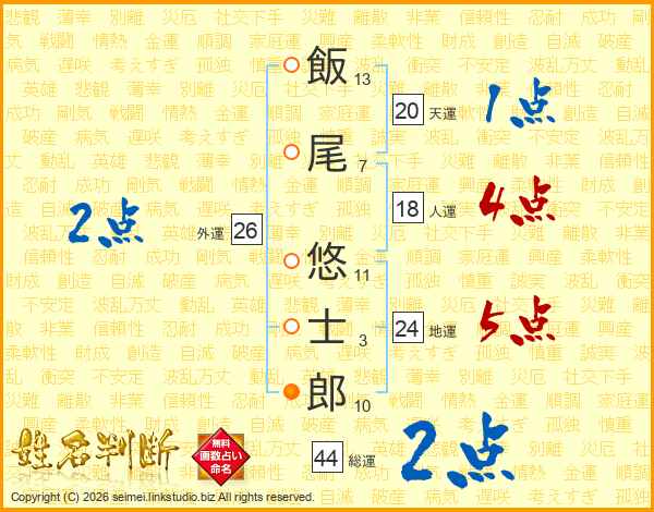 飯(13画)尾(7画) 悠(11画)士(3画)郎(10画)