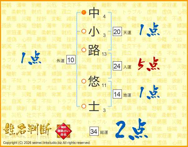 生活面を象徴する運勢です。外部から受ける影響力を表し、結婚運、家庭運や職場、環境への順応性を表します。総運から人運を引いた画数。姓や名が1文字の場合を除く。