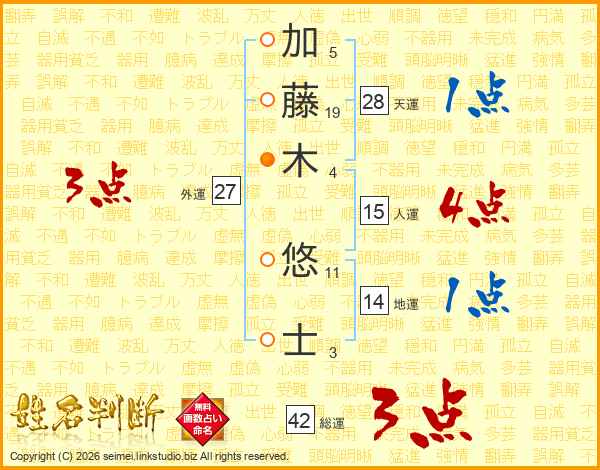 加(5画)藤(19画)木(4画) 悠(11画)士(3画)
