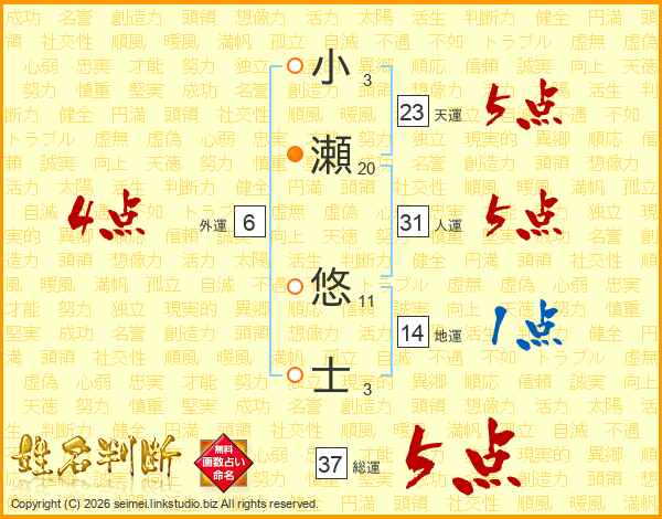 小(3画)瀬(20画) 悠(11画)士(3画)