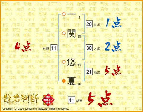 生活面を象徴する運勢です。外部から受ける影響力を表し、結婚運、家庭運や職場、環境への順応性を表します。総運から人運を引いた画数。姓や名が1文字の場合を除く。