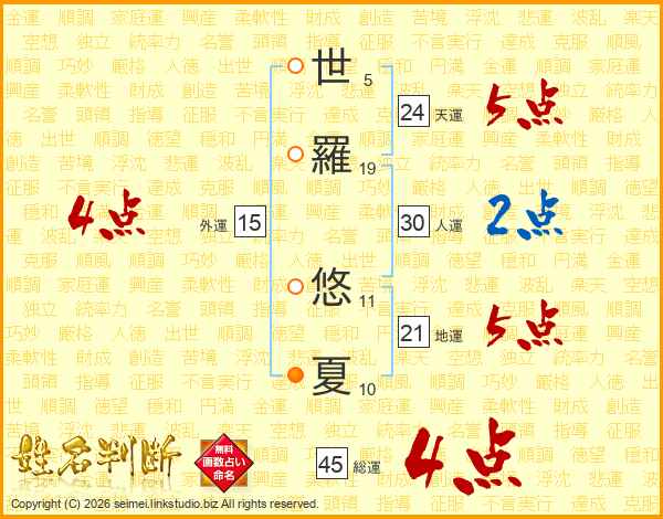 世(5画)羅(19画) 悠(11画)夏(10画)