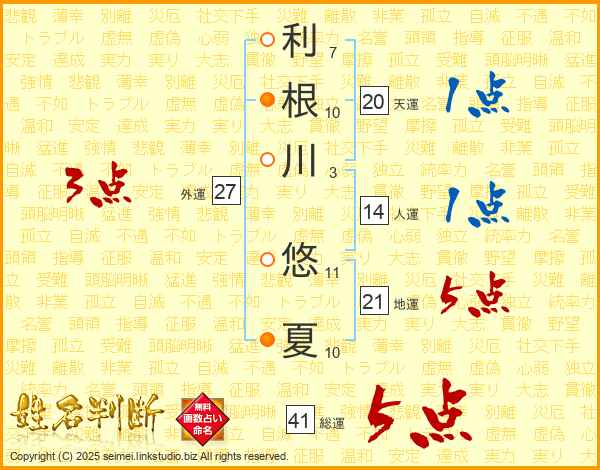 利(7画)根(10画)川(3画) 悠(11画)夏(10画)