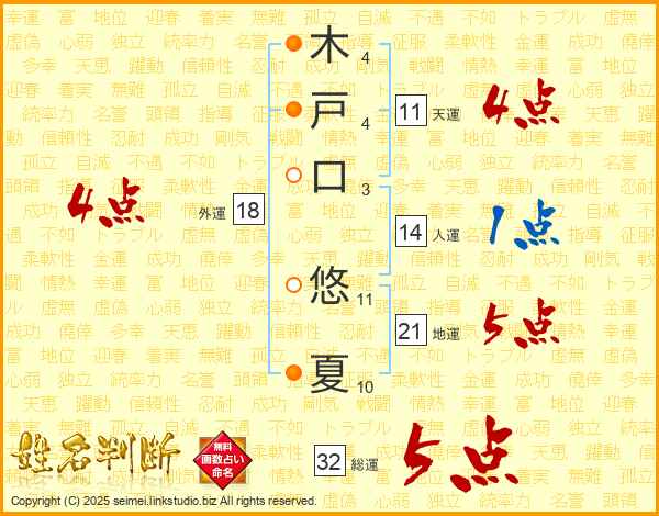 木(4画)戸(4画)口(3画) 悠(11画)夏(10画)