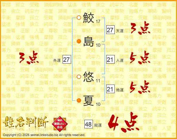 鮫(17画)島(10画) 悠(11画)夏(10画)