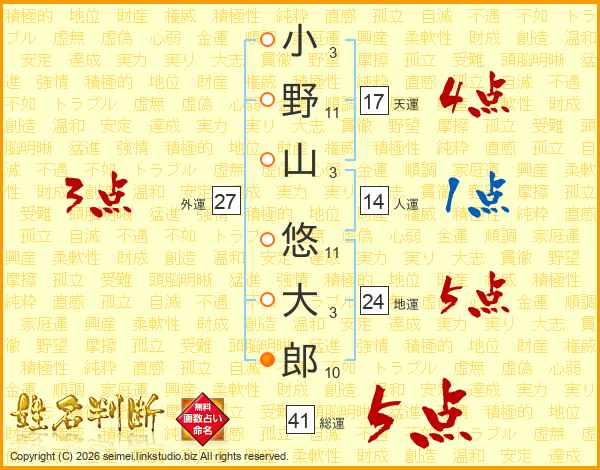 小(3画)野(11画)山(3画) 悠(11画)大(3画)郎(10画)