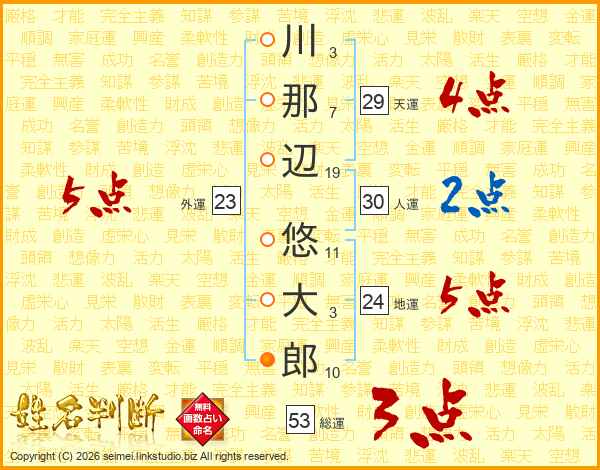 川(3画)那(7画)辺(19画) 悠(11画)大(3画)郎(10画)
