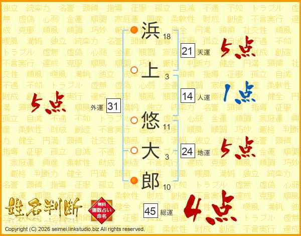 浜(18画)上(3画) 悠(11画)大(3画)郎(10画)