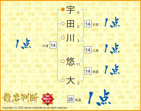 宇(6画)田(5画)川(3画) 悠(11画)大(3画)