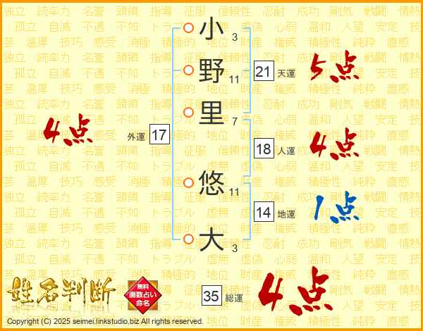 小(3画)野(11画)里(7画) 悠(11画)大(3画)