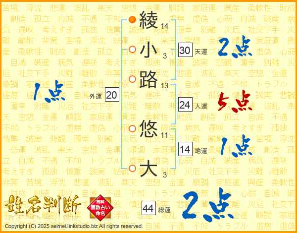綾(14画)小(3画)路(13画) 悠(11画)大(3画)