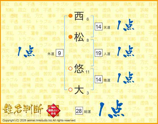 生活面を象徴する運勢です。外部から受ける影響力を表し、結婚運、家庭運や職場、環境への順応性を表します。総運から人運を引いた画数。姓や名が1文字の場合を除く。