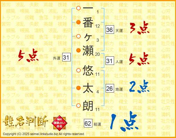 一番ヶ瀬悠太朗さんの人運は31画の5点!