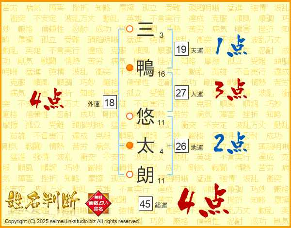 三(3画)鴨(16画) 悠(11画)太(4画)朗(11画)