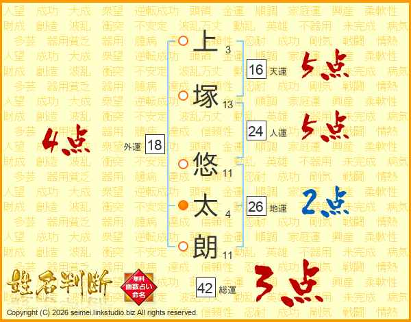 上(3画)塚(13画) 悠(11画)太(4画)朗(11画)