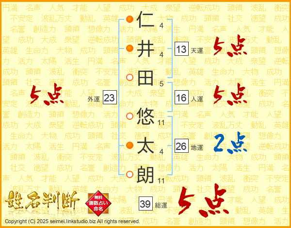 仁(4画)井(4画)田(5画) 悠(11画)太(4画)朗(11画)