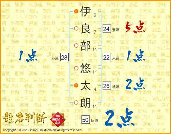 伊(6画)良(7画)部(11画) 悠(11画)太(4画)朗(11画)