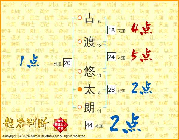 古(5画)渡(13画) 悠(11画)太(4画)朗(11画)
