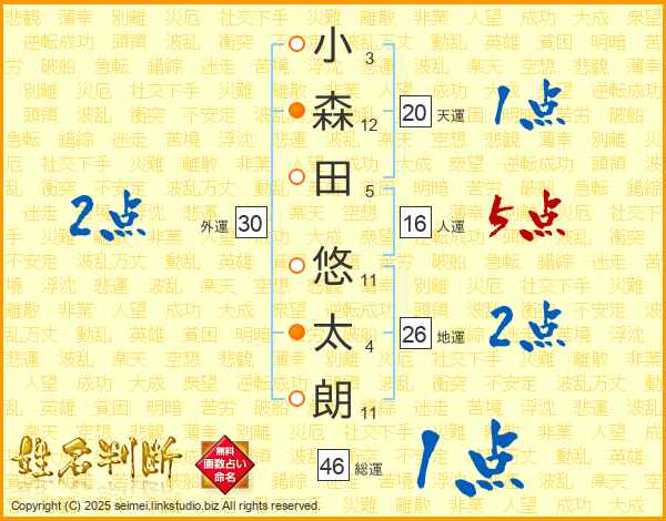 小(3画)森(12画)田(5画) 悠(11画)太(4画)朗(11画)