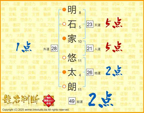 明(8画)石(5画)家(10画) 悠(11画)太(4画)朗(11画)