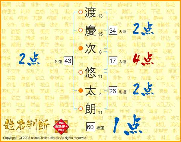 渡(13画)慶(15画)次(6画) 悠(11画)太(4画)朗(11画)