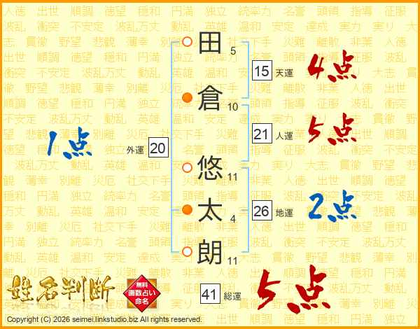 田(5画)倉(10画) 悠(11画)太(4画)朗(11画)