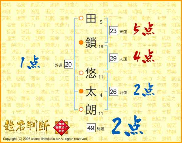 田(5画)鎖(18画) 悠(11画)太(4画)朗(11画)
