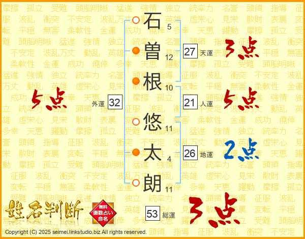 石(5画)曽(12画)根(10画) 悠(11画)太(4画)朗(11画)
