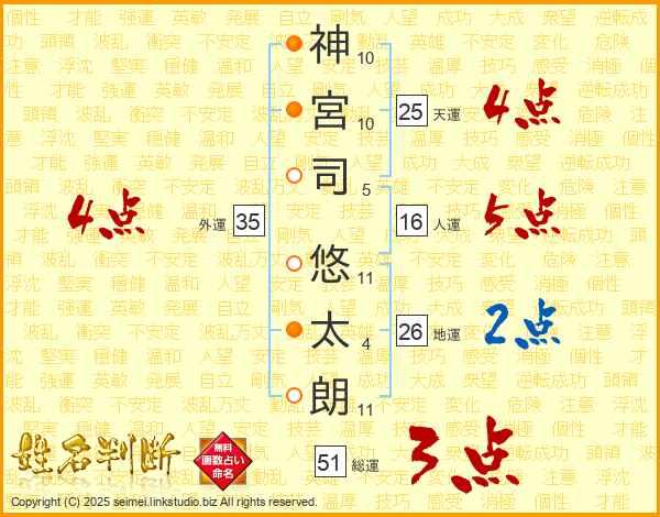 神(10画)宮(10画)司(5画) 悠(11画)太(4画)朗(11画)