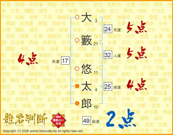 大(3画)籔(21画) 悠(11画)太(4画)郎(10画)